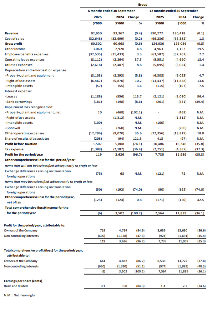 Our Group’s revenue decreased by 0.4%, or $0.4 million, from $93.4 million for the six months ended 30 September 2024 (“2H2024”) to $93.0 million for 2H2025. On a full year basis, the decrease in revenue in 2H2025 was largely offset by the increase in revenue recorded in 1H2025. As a result, the Group’s revenue for FY2025 decreased marginally by 0.1%, or $0.1 million, from $190.4 million in FY2024 to $190.3 million in FY2025.