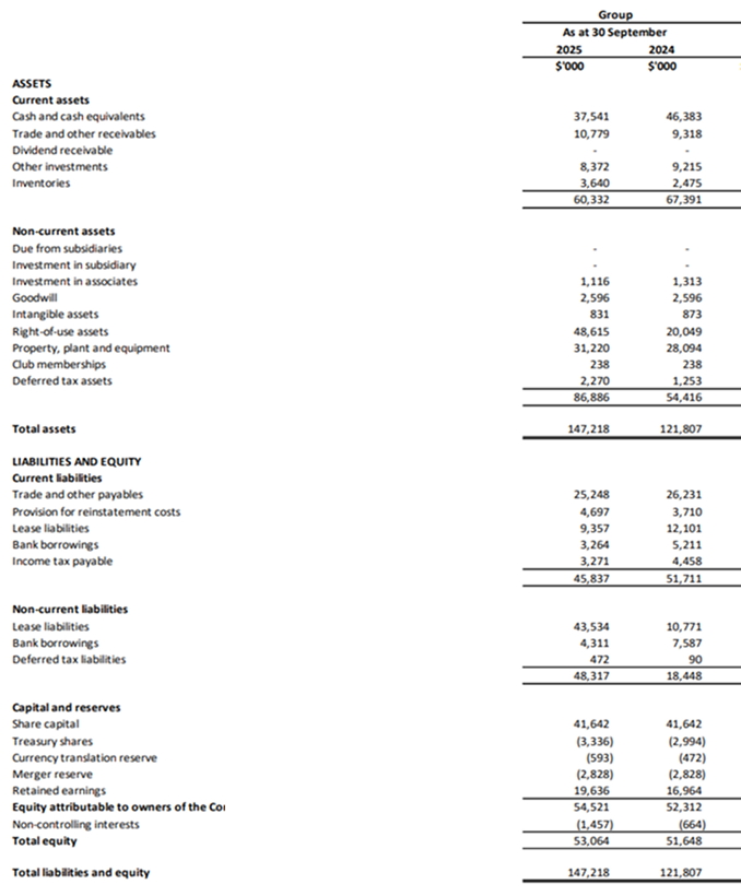 The Group’s current assets decreased by $7.1 million to $60.3 million as at 30 September 2025, largely due to: